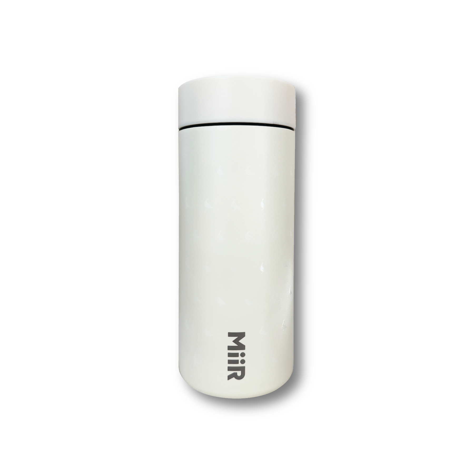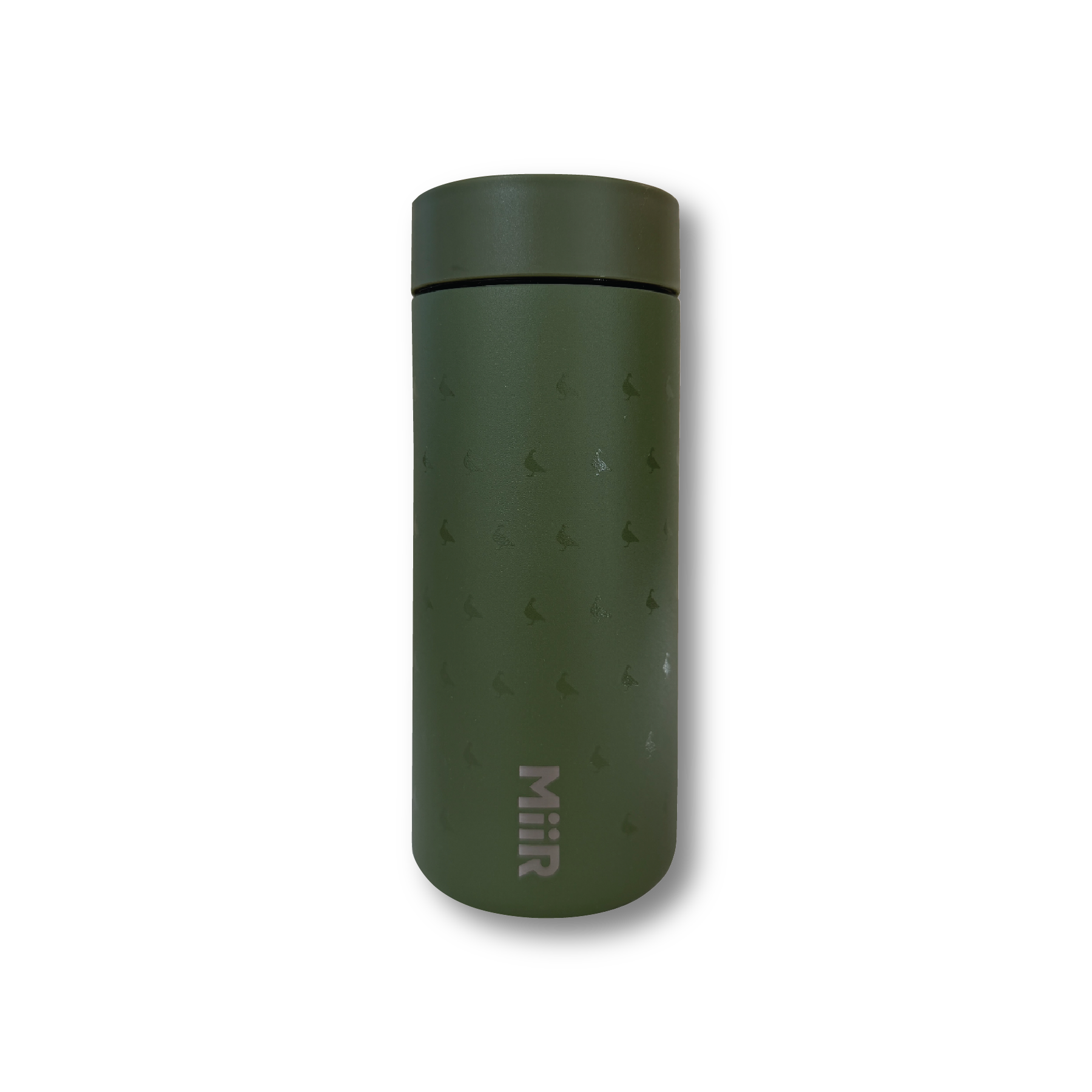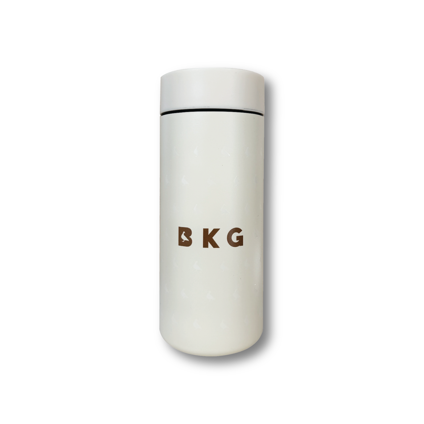 Minimally designed 12oz travel mug with classic BKG logo and repeat pigeon spot varnish. Available in evergreen and ivory.